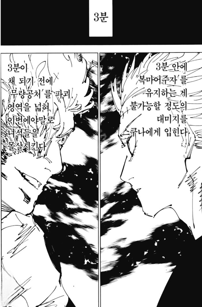 메이메이의 까마귀를 통해 고죠 사토루와 스쿠나의 전투를 관전한 옷코츠. 그리고 이미 무량공처를 겪어본 스쿠나. 3분 안에 서로의 영역을 먼저 부숴야 하는 데스매치가 다시 시작됩니다.