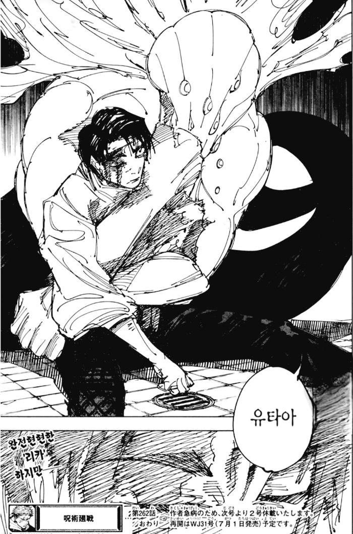 주술회전 262화는 분량이 매우 짧아서 아쉬웠습니다. 아마 작가도 스토리를 짜내기 쉽지 않은 듯합니다. 262화에서 가장 인상적인 부분은 빈 껍데기라고 할 수 있는 옷코츠의 육신을 끌어안고 눈물을 흘리고 있는 특급 과주 원령 '리카'였습니다. 매우 큰 슬픔과 분노가 느껴지는 듯합니다.