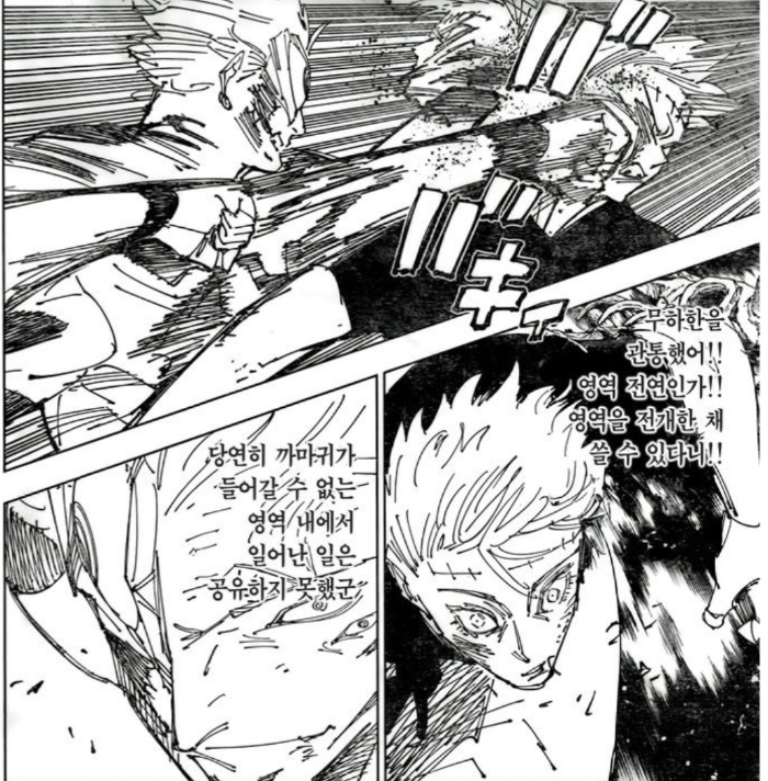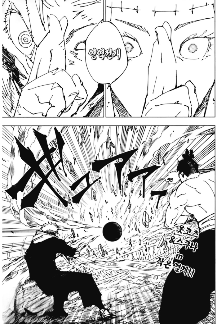 까마귀가 들어갈 수 없는 영역 내에서 일어난 고죠와 스쿠나의 전투를 알지 못하는 옷코츠. 영역을 전개한 채 영역 전연을 사용해 옷코츠를 공격하는 스쿠나입니다.