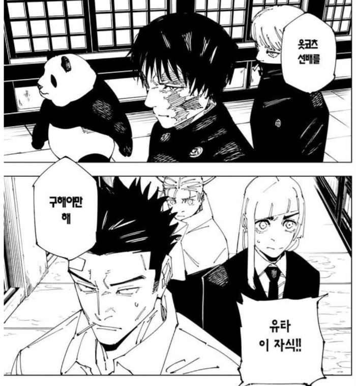 다 같이 모여서 옷코츠를 구해야만 한다며 이동합니다. 스쿠나와의 전투에 직접적으로 참여했던 쿠사카베와 젠인 마키의 생존이 확인됩니다. 그런데 옷코츠를 구해야 한다는 것이 구체적으로 어떤 상황인지 등장하지 않은 체 마무리됩니다. 대화를 보아하니 심각한 상황은 아닌 것으로 추정됩니다. 개인적인 예상으로 아마도 옷코츠는 가쿠간지가 야가학장에게 전달받은 완전 자립형 주해의 제조방법을 통해, 즉 판다처럼 주해로서 부활한 것은 아닐지 생각해 봅니다. 마치 헌터x헌터의 카이토의 부활과 비슷한 느낌으로 말이죠.