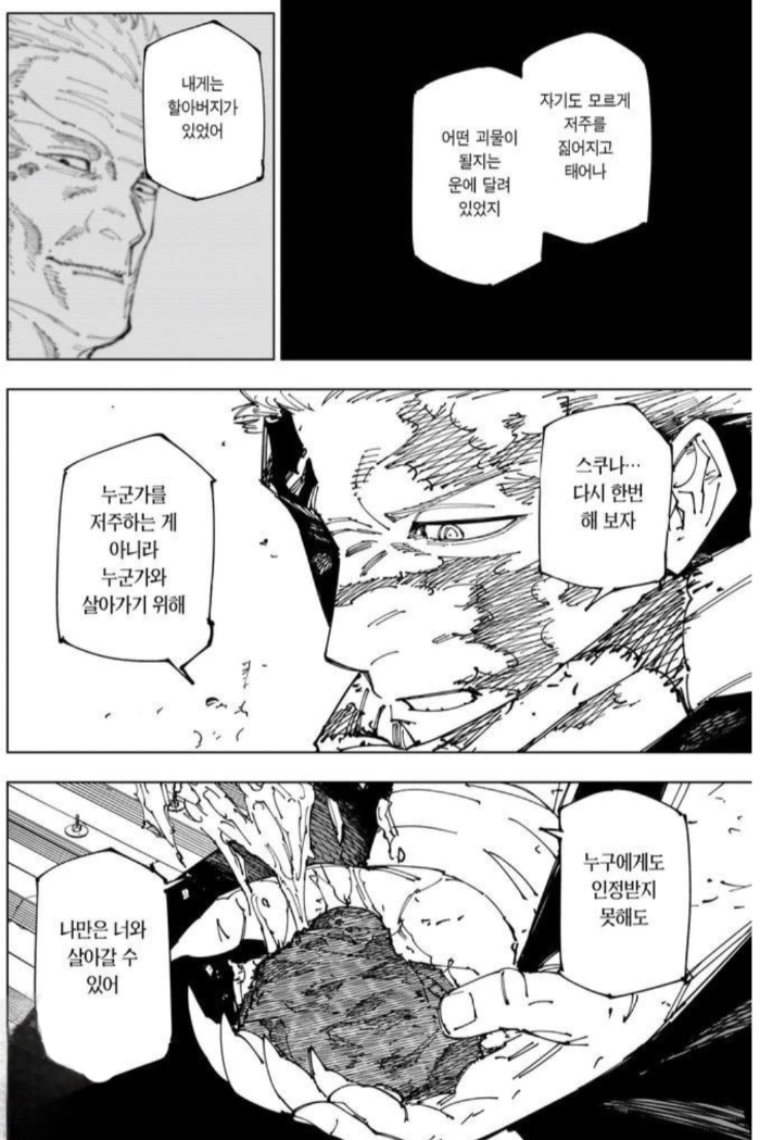 메구미의 몸을 잃고, 작은 조각만 남아 최후를 앞둔 저주의 왕 스쿠나. 이타도리는 그래도 몸을 공유했던 사이랍시고, 스쿠나를 품어줄 호의를 내비칩니다. 그러나 저주의 왕답게 자존심을 굽히지 않고 최후를 맞이합니다. 정말 다행스럽네요.